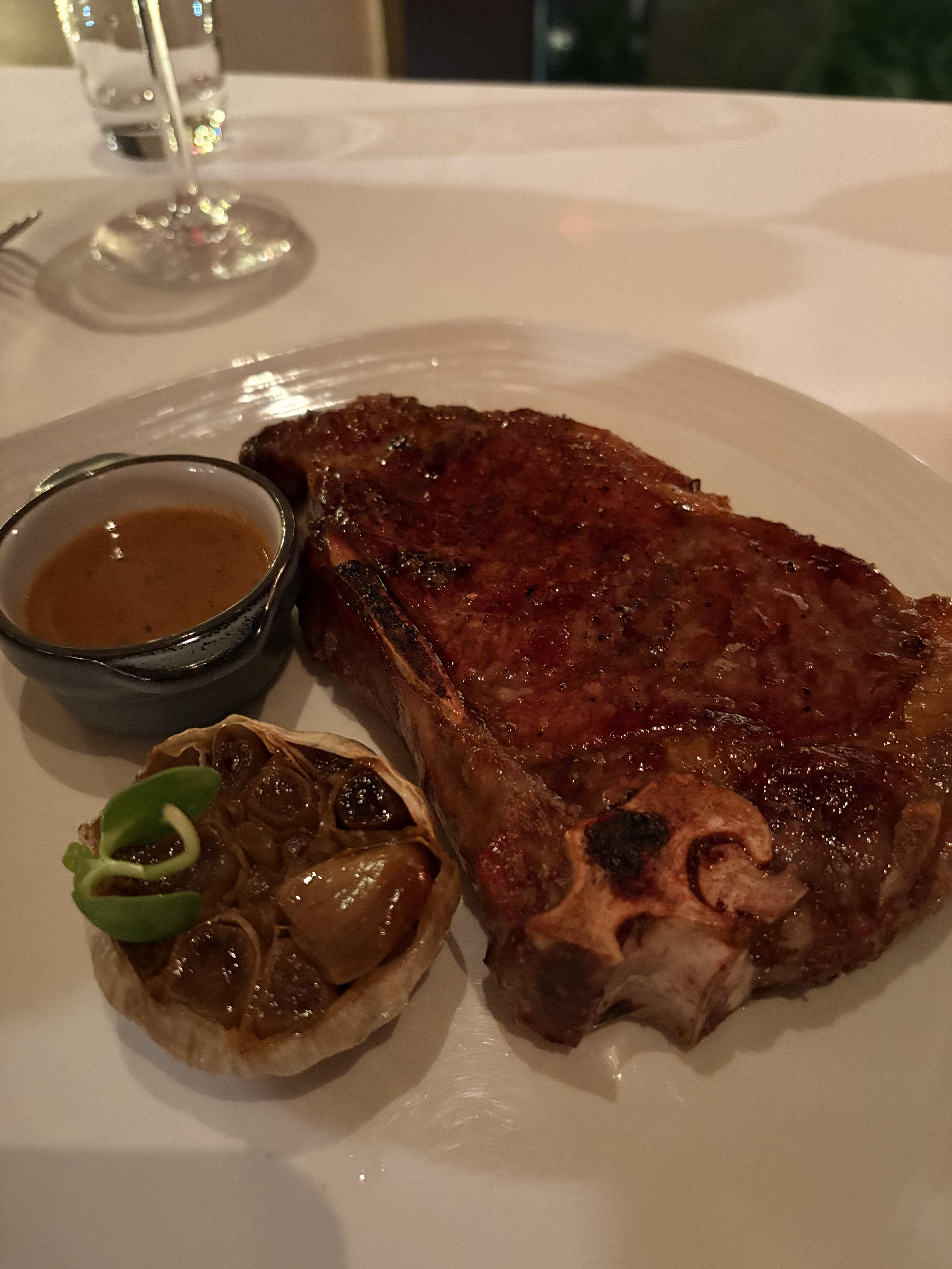다음으로 나왔던 스테이크입니다. 뉴욕 스트립 본 인 이라는 스테이크 였는데요. 스테이크는 맛이 없을 수가 없기 때문에 맛있게 먹었던 것 같습니다. 함께 나왔던 잔 와인도 곁들였는데 잘 어울렸던 것 같습니다.