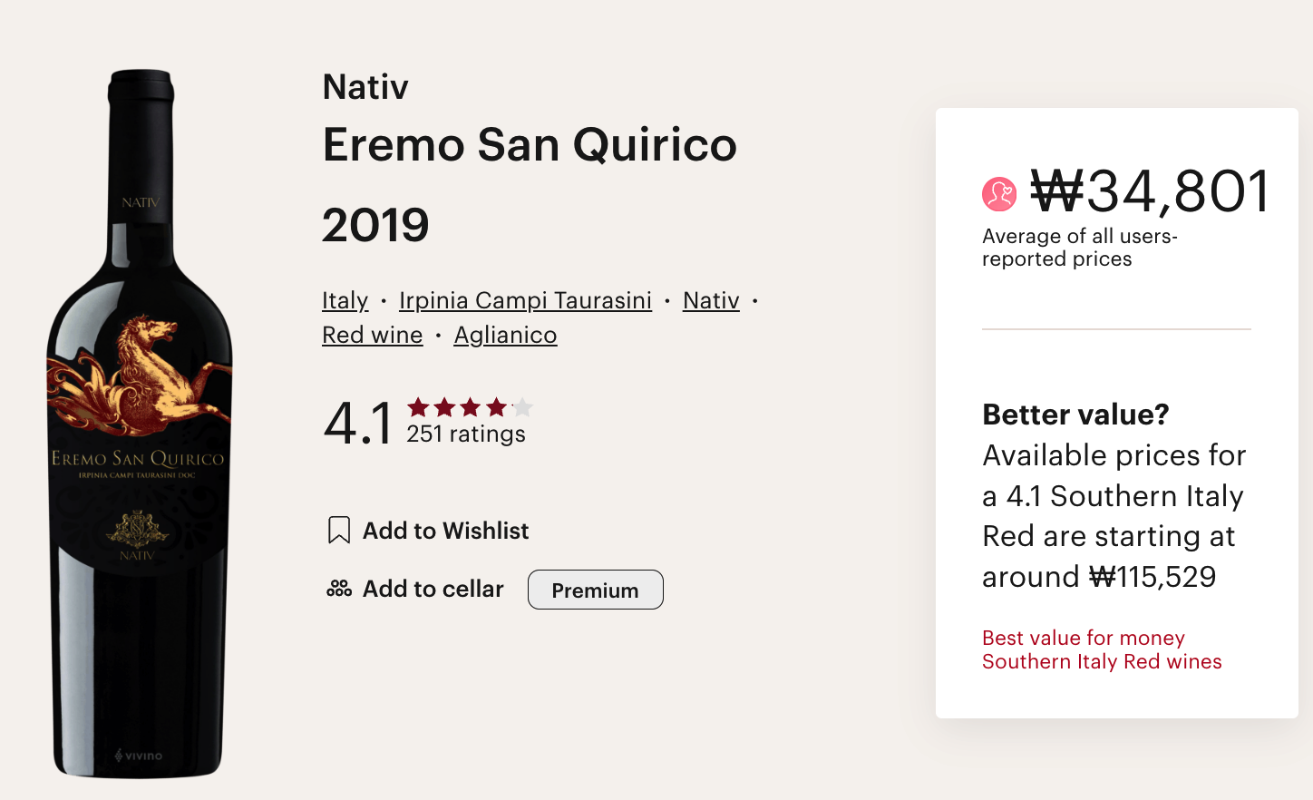 나티브 에레모 산 퀴리코 2019 빈티지 Vivino 평점은 4.1점이며, 제 개인적인 평점은 4.3입니다.
